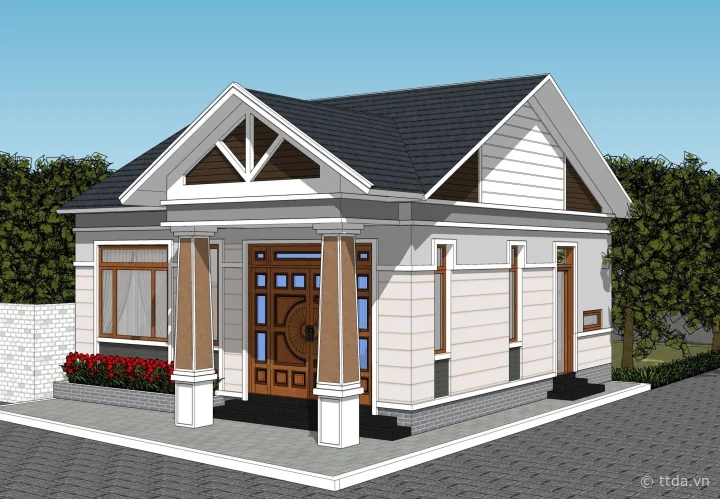 Chỉ với một chút cách điệu phần mái đã khiến căn nhà trở nên thời thượng hơn bao giờ hết. Phần mái chéo tạo sự ấn tượng, nổi bật cho căn nhà khi nhìn tổng thể bên ngoài. Không gian các căn phòng không cần quá trọng về thiết kế nhưng phải được đảm bảo tối đa công năng sử dụng tiện ích cho gia đình. Tương tự mẫu nhà sân vườn, không gian vườn tô điểm thêm cho căn nhà khiến căn nhà vừa hiện đại lại vừa thoáng đãng, hài hoà với thiên nhiên.