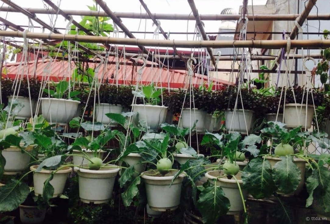 Đây là một cách trồng rau trên sân thượng khá đơn giản. Thay vì trồng các loại hoa, gia chủ có thể sử dụng chậu cây treo để trồng rau, vừa đảm bảo cung ứng rau sạch cho gia đình, vừa tạo không gian mát mẻ trên sân thượng.
