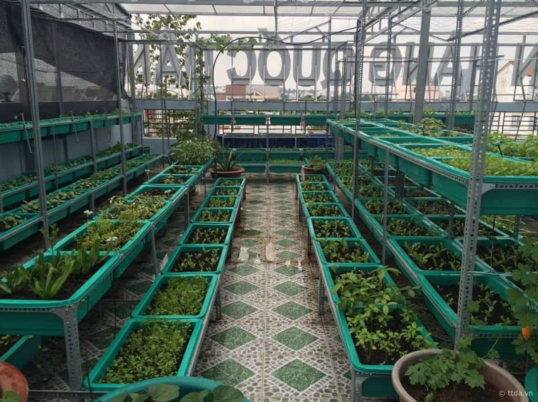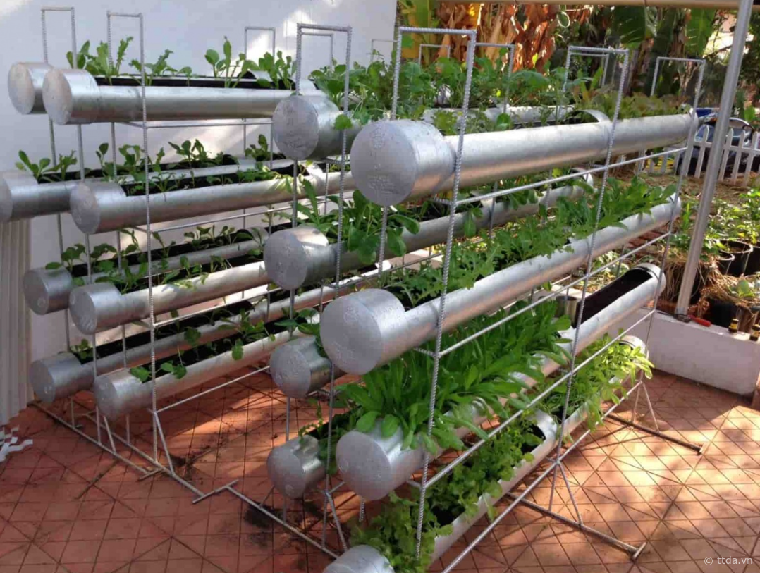 Với cách trồng này, gia chủ có thể tận dụng tối đa không gian trên sân thượng. Gia chủ có thể tự thiết kế hoặc đặt làm các khung sắt tại những công ty thiết kế, thi công vườn rau trên sân thượng. Khung sắt nên gồm 2-3 kệ, không quá cao tránh việc chăm sóc và thu hoạch vườn rau trên sân thượng trở nên khó khăn.