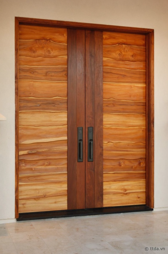 Mẫu cửa nhà bằng gỗ tự nhiên 2 cánh này có họa tiết đơn giản đối xứng tự nhiên, toát lên vẻ đẹp thanh lịch.