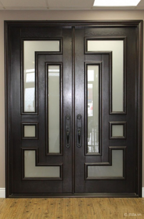 Mẫu cửa nhà đẹp 2 cánh màu đen huyền bí thể hiện quyền lực cho gia chủ, sang trọng và cho ngôi nhà. Áp dụng hệ thống kính tạo nên sự hiện đại thay cho các tấm ốp tạo lên nét đặc trưng cho toàn căn hộ.