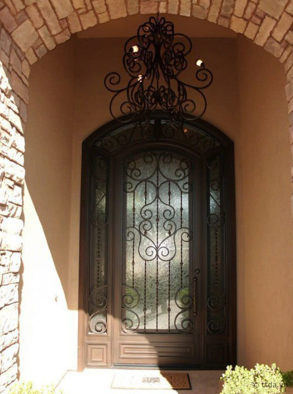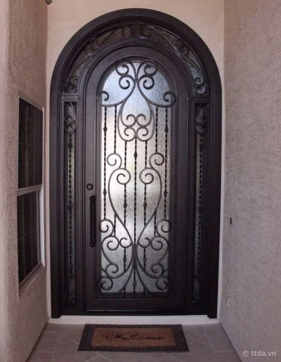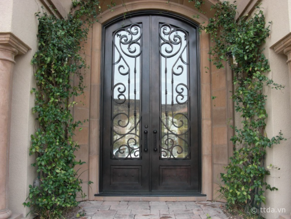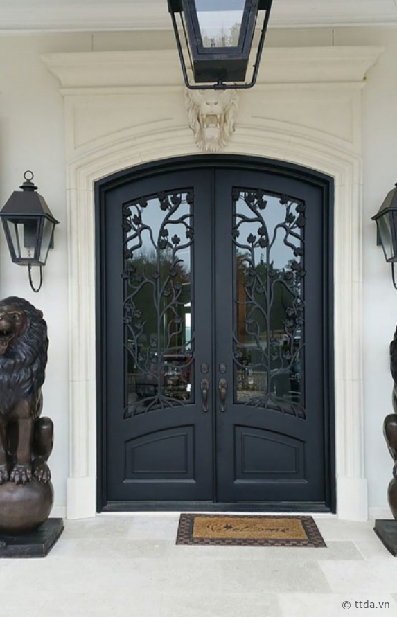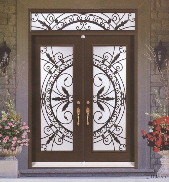 Những thanh sắt lượn sóng tạo điểm nhấn cho chiếc cửa bớt cứng nhắc hơn, mang đến một mẫu cửa nhà 2 cánh đẹp cổ điển mềm mại hơn.
