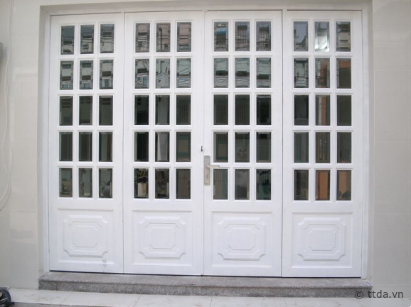 Mẫu cửa 4 cánh mặt tiền bằng những họa tiết đơn giản, song song được sử dụng phổ biến cho cả nhà ống và nhà phố.