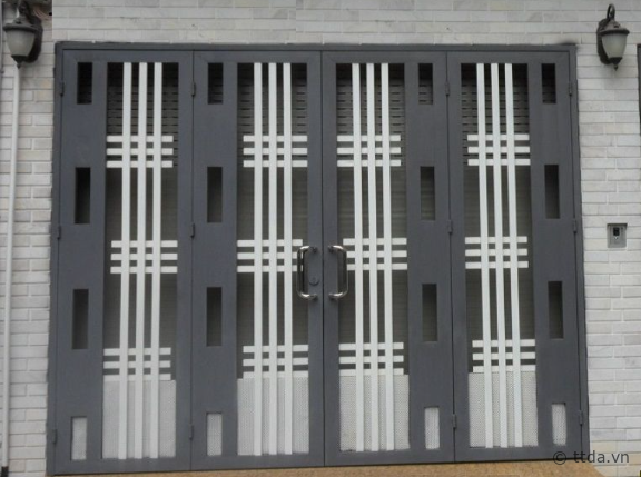 Cửa sắt có điểm nhấn ở mỗi cánh bằng các ô vuông bắt mắt