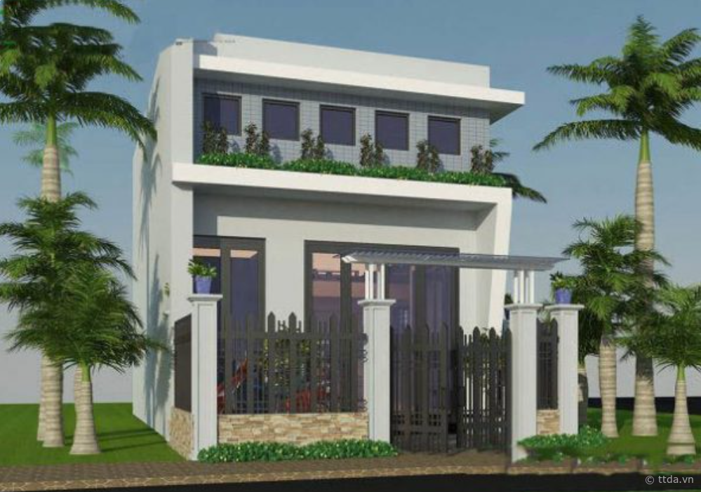 Đôi vợ chồng trẻ có kinh tế khá nên đã mua được mảnh đất có mặt tiền 7m. Do đó, chúng tôi thiết kế một khoảng sân trước nhà làm nơi để xe máy, trồng cây cảnh. Toàn bộ hệ thống cửa chính, cửa sổ của ngôi nhà sử dụng kính màu ghi xám. Chất liệu kính cản tia cực tím có hại cho sức khỏe của người sử dụng. Ở tầng gác lửng chúng tôi thiết kế một lan can nhỏ đua ra để trồng cây cảnh. Vì vậy, hệ thống cửa kính vuông có thể mở ra để tưới cây mỗi ngày.