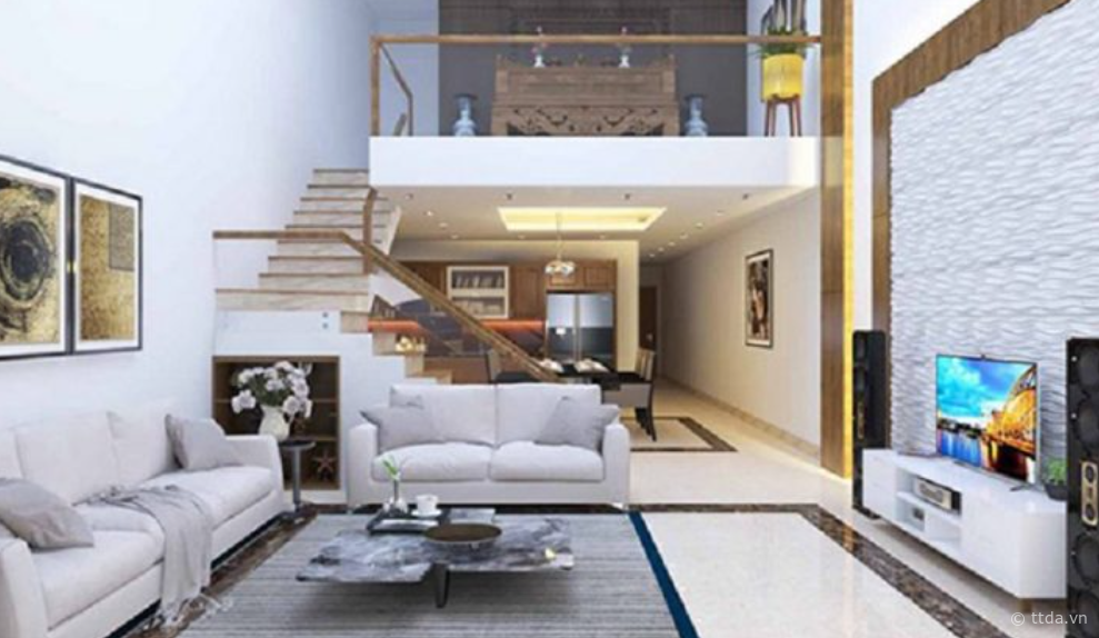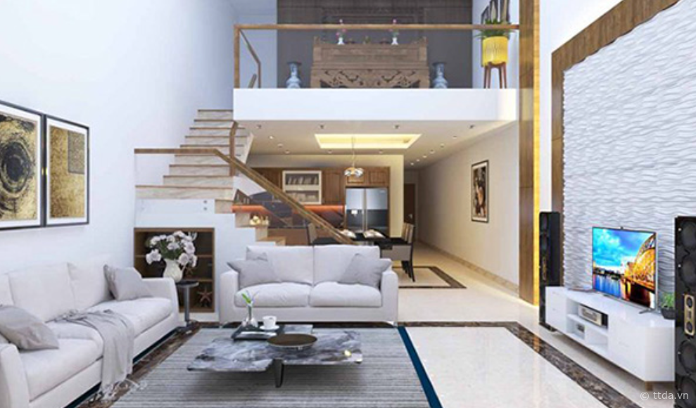Ngăn cách giữa phòng khách và phòng bếp là hệ thống cầu thang. Cách bậc cầu thang lát gạch trắng chống trơn trượt. Hệ thống vịn cầu thang được loại bỏ. Thay vào đó là kính chịu lực trong suốt, an toàn cho người sử dụng. Bức tường phía sau kệ ti vi được ốp đá có vân gợn sóng. Đây là loại đá ngọc trai, chiếu đèn vào sẽ trở nên lấp lánh. Đây là kỹ thuật sử dụng màu sắc trong tranh sơn mài của Việt Nam.