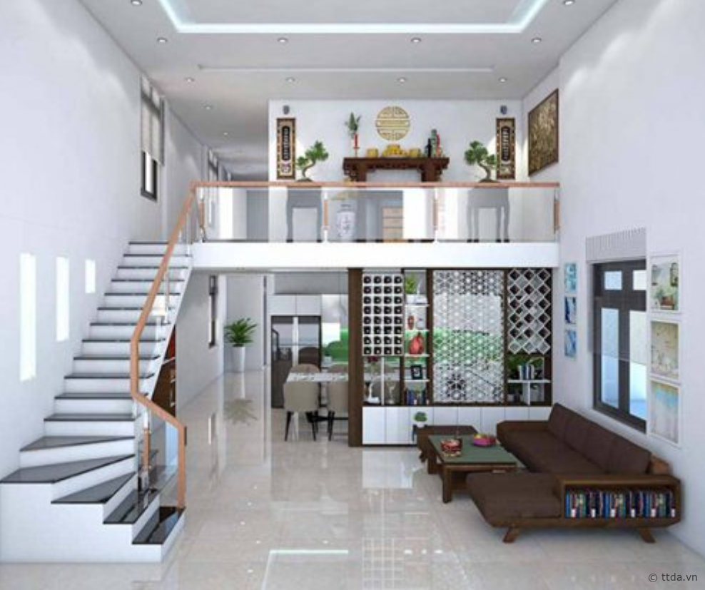 Ngăn cách giữa phòng khách và phòng bếp ăn là hệ thống hộc tủ. Có thiết kế dùng để đồ trang trí, ảnh gia đình, rượu, lọ hoa. Nhà vệ sinh đặt ở trong cùng của tầng một. Trước cửa phòng WC đặt một chậu cây cảnh có tính khử mùi, lọc không khí.